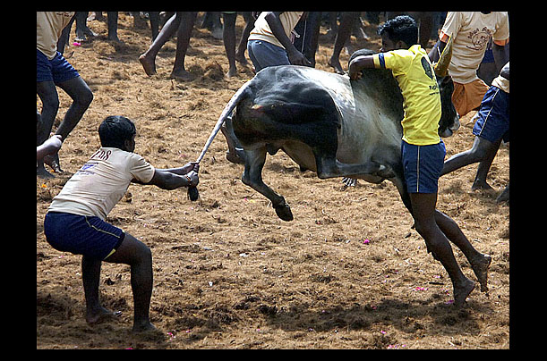 By the Tail Villagers attempt to subdue a bull during an annual bull-taming festival in Madurai, India.