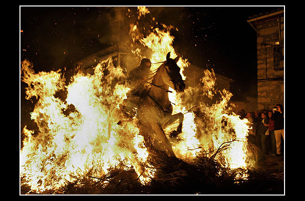 A man rides a horse through a bonfire in the village of San Bartolome de Pinares, Spain, as part of a festival honoring Saint Anthony, the patron saint of animals.