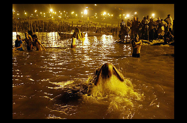 Hindu devotees immerse themselves in the water where the Ganges, Yamuna and Saraswati rivers converge, in Allahabad, India. The ritual is part of the 45-day Ardh Kumbh Mela Festival.