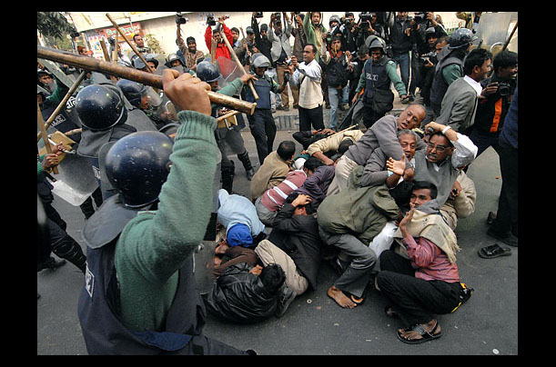 Activists Riot police charge a group of protesters outside the presidential palace in Dhaka, Bangladesh.