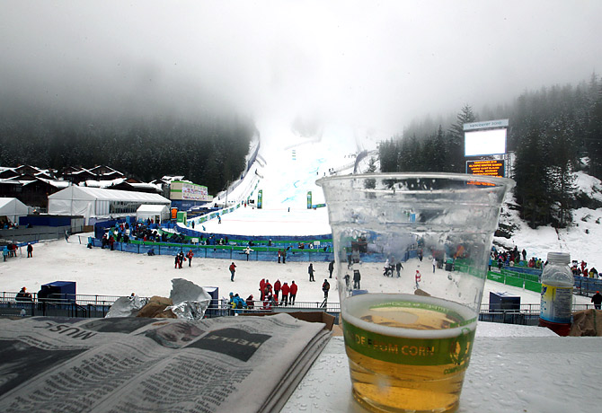 A beer left by a spectator near the finishing area of the women's giant slalom