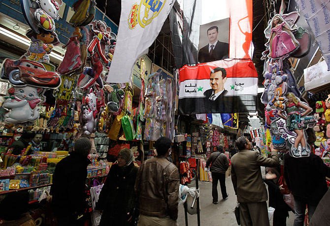 Syrian flags with images of President Bashar Assad decorate the street scene in Damascus on Feb. 5, 2011